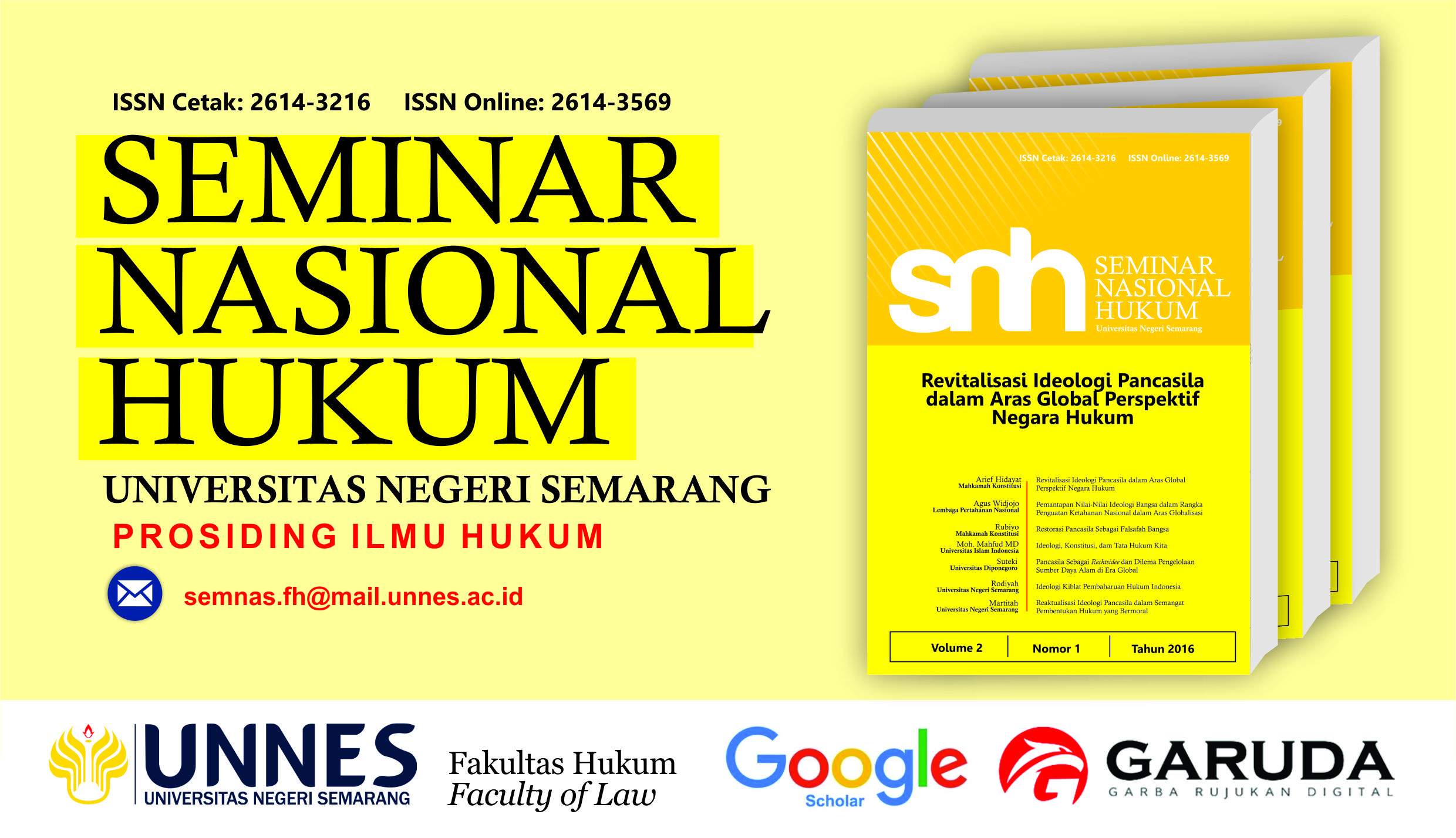 Seminar Nasional Hukum Universitas Negeri Semarang (ISSN Online 2614-3569, ISSN Print 2614-3216) merupakan Prosiding yang memuat artikel-artikel yang telah dideseminasikan dalam kegiatan Seminar Nasional yang diselenggarakan oleh Fakultas Hukum Universitas Negeri Semarang. Seminar Nasional Hukum Universitas Negeri Semarang berkomitmen menjadi wadah akademik bagi pakar hukum, pemerhati, akademisi, peneliti, mahasiswa, dan masyarakat yang memiliki kepedulian terhadap perkembangan hukum dan isu-isu penegakan hukum di Indonesia. Secara berkala, Seminar Nasional Hukum Universitas Negeri Semarang mengangkat tema-tema khusus yang kekinian sehingga Seminar Nasional Hukum Universitas Negeri Semarang mampu menjadi forum pakar hukum dari berbagai instansi di seluruh Indonesia. Seminar Nasional Hukum Universitas Negeri Semarang telah terindeks di Google Scholar, Portal Garuda, Resources of Open Access Directory